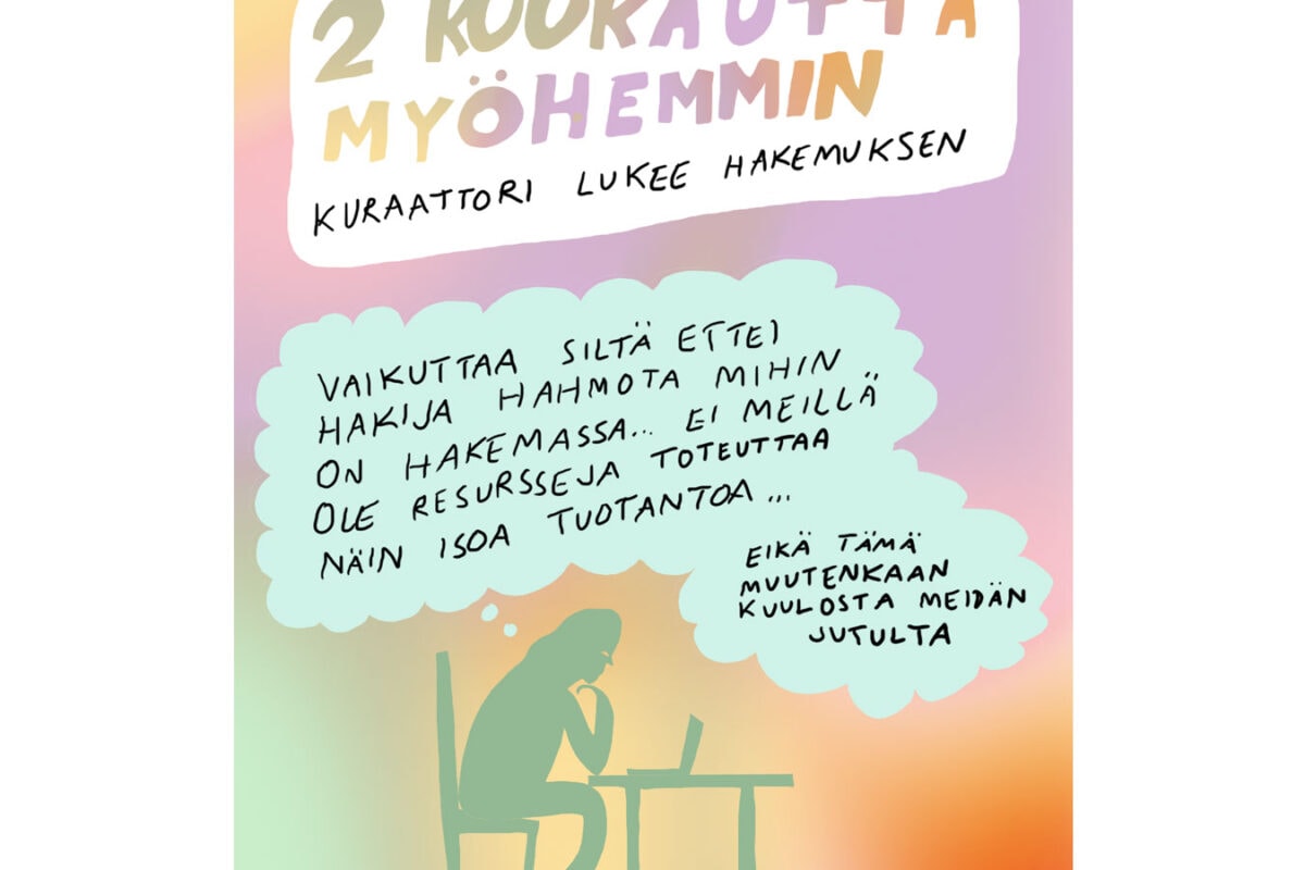 6. 2 kuukautta myöhemmin kuraattori lukee hakemuksen. Vaikuttaa siltä ettei hakija hahmota mihin on hakemassa… Ei meillä ole resursseja toteuttaa näin isoa tuotantoa… Eikä tämä muutenkaan kuulosta meidän jutulta