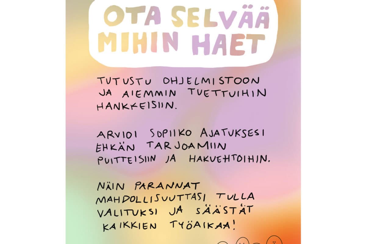 7. Ota selvää mihin haet. Tutustu ohjelmistoon ja aiemmin tuettuihin hankkeisiin. Arvioi sopiiko ajatuksesi Ehkän tarjoamiin puitteisiin ja hakuehtoihin. Näin parannat mahdollisuuttasi tulla valituksi ja säästät kaikkien työaikaa!
