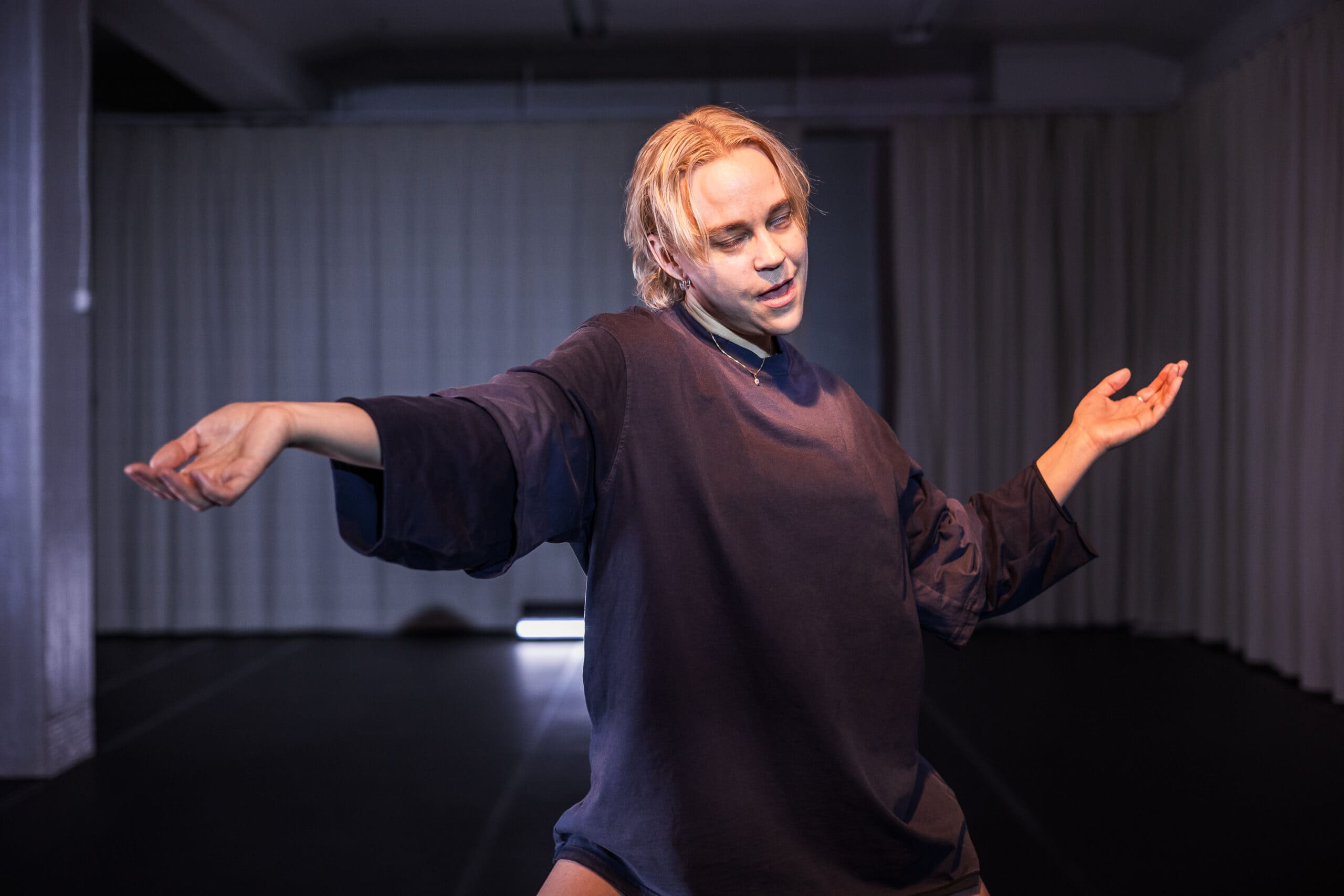 Hän hymyilee, luo filrttailevia ja vihjailevia katseita yleisöön. Kasvoilla häivähtelee rajaton kirjo jonkinlaisia opittuja ja harkittuja ehdotuksia, eleitä. Maskuliini, feminiini, nonbinääri sekoittuvat. En ole varma, milloin nämä eleet luovat jonkinlaisia yhteyksiä katsojan ja esiintyjän välille, milloin niissä on vallankäyttöä. Nieminen pysyttelee koko ajan lähellä yleisöä Luca Sirviön staattisessa, hieman hämyisessä valosuunnittelussa. Kasvojen tanssissa kaikkein pienimmätkin eleet tulevat näkyväksi, ovat keskiössä. Niemisen ilmeily huvittaa, mutta samalla tunnen epämukavuutta.
