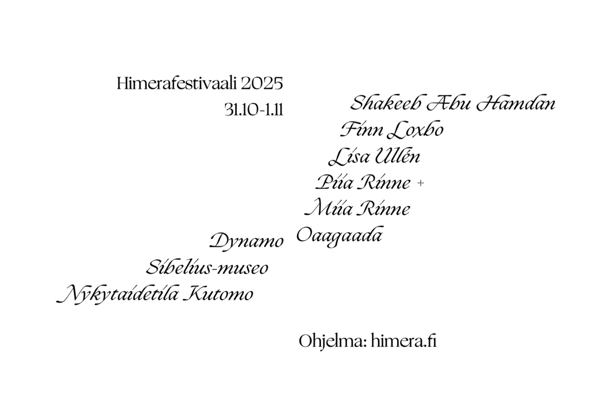The festival events will be held at Dynamo, The Sibelius Museum, and Contemporary Art Space Kutomo in Turku from October 31 to November 1, 2025. The festival is organized by Himera in collaboration with Ehkä-production. The event is supported by the City of Turku.